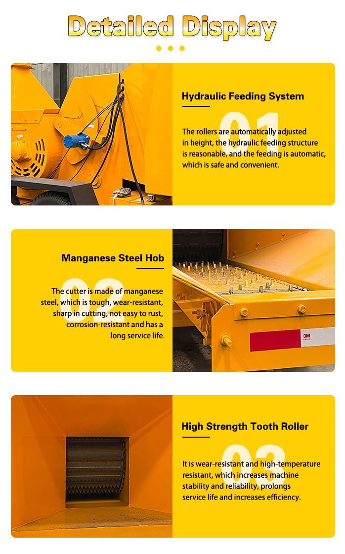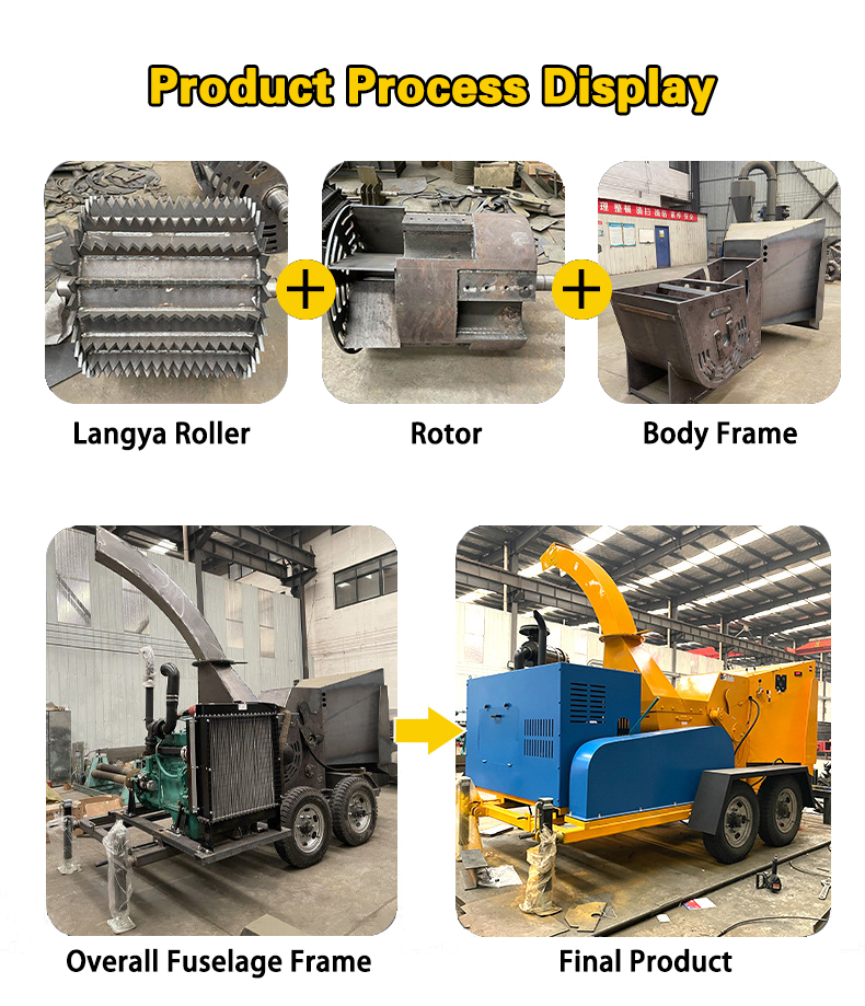 This machine can crush branches, leaves, logs, bamboo and other plants up to diameter of 25cm, and can quickly cut raw materials into small wood chips, with a maximum output of 5 tons/h. The hydraulic forced feeding system saves labor and increases the feeding speed; the machine uses A8 blades, which have a service life three times that of conventional blades; the chain plate design can make work more efficient. There are two power modes: electric and diesel. There is no problem in working in the field. The discharge port can be rotated 360 degrees. The tires are equipped with high-quality tires and thickened steel plates, so the quality is reliable!