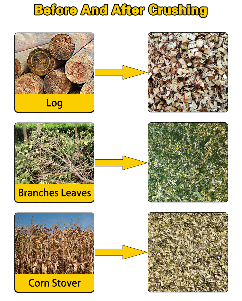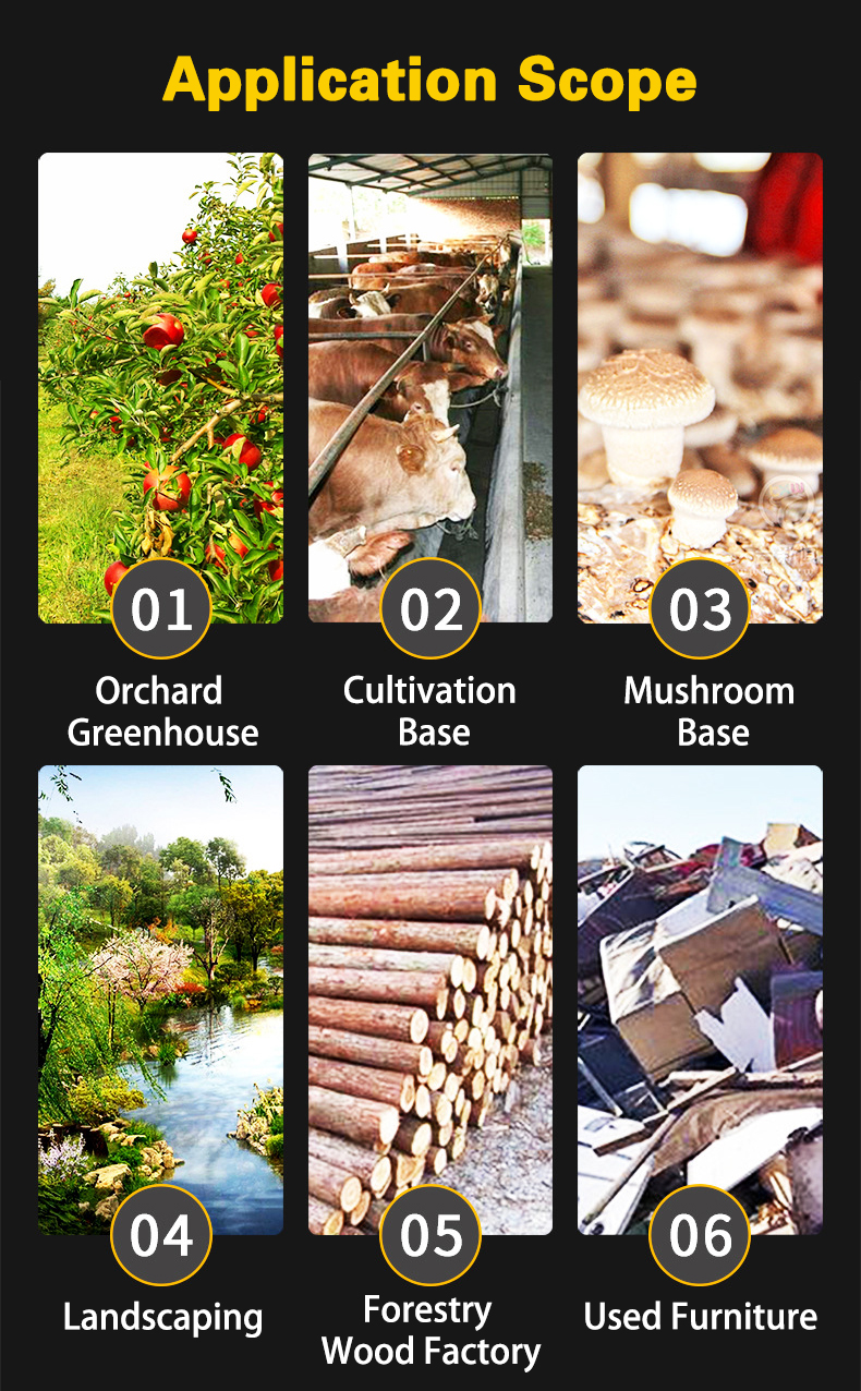 The branch chipper can cut logs, branches, tree bark, tree roots and corn cobs. Straw, peanut shells. It is made into sawdust or wood chips with other materials. It is widely used in the production of wood pellets, power plants, raw materials for medicinal diets, etc. Carbon treatment. Wooden board. Organic fertilizer. Aquaculture, personal or small business gardening.