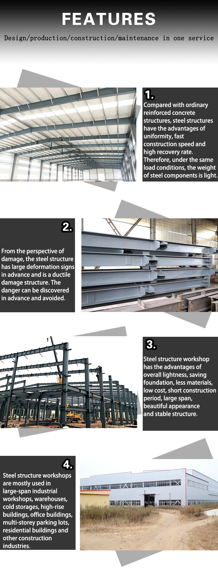 1. Steel structure buildings are lightweight, have high strength and large spans.